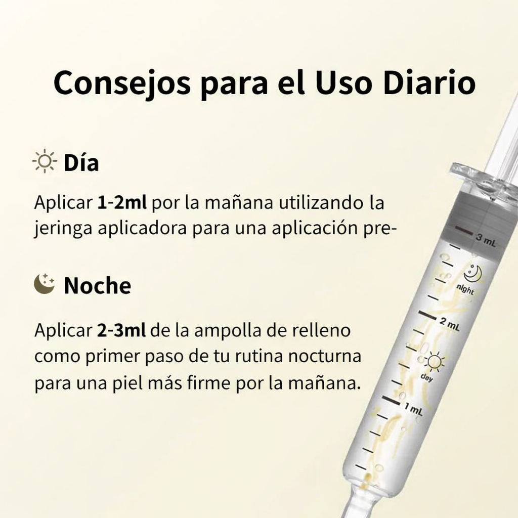 Inserte la jeringa y extraiga aproximadamente 1 ml de sérum por aplicación. Recomendamos comenzar con 1 ml, pero no hay problema en usar un poco más si es necesario, especialmente en zonas secas o envejecidas.